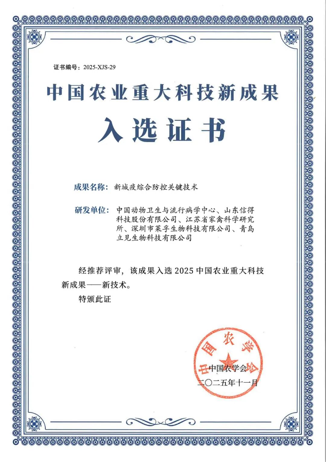 此次中國農(nóng)業(yè)重大科技成果遴選由中國農(nóng)學(xué)會組織,緊扣中央經(jīng)濟(jì)工作會議部署,聚焦農(nóng)業(yè)科技成果轉(zhuǎn)化應(yīng)用,強(qiáng)化農(nóng)業(yè)科技對穩(wěn)產(chǎn)保供與鄉(xiāng)村全面振興的支撐引領(lǐng)作用。經(jīng)多輪嚴(yán)格評審,共遴選出新技術(shù)37項(xiàng),其中獸醫(yī)類新技術(shù)2項(xiàng)。本技術(shù)憑借突出技術(shù)引領(lǐng)性、應(yīng)用實(shí)效性和場景適配性脫穎而出。